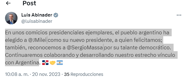 En su cuenta de “X”, (antes Twitter), Abinader aseguró que, “a través de unos comicios presidenciales ejemplares”, el pueblo argentino ha elegido a Miley como su nuevo mandatario.