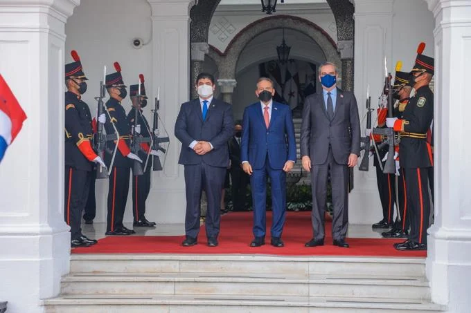 El presidente Luis Abinader fue recibido en el Palacio Presidencial de Panamá por su homólogo, Laurentino Cortizo Cohen, luego de que llegará al país del Istmo para dar continuidad a acuerdos planteados durante la pasada Asamblea General de la Organización de las Naciones Unidas (ONU).