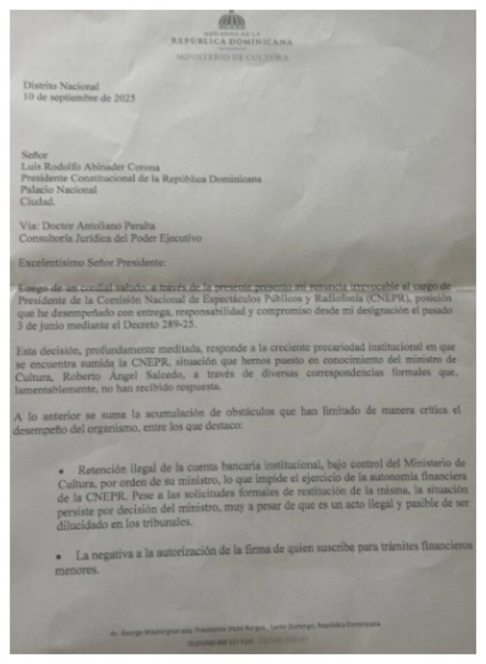 En una carta dirigida al presidente de la República, Luis Abinader, y remitida a través del consultor jurídico del Poder Ejecutivo, Antoliano Peralta, Aybar explicó que su salida responde a una situación “profundamente meditada” ante lo que considera una creciente precariedad dentro del organismo.