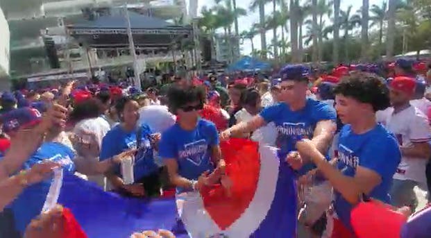 Con güira, banderas, plátanos, bailes y merengue típico, así celebraron los dominicanos a las afueras del LoanDepot Park de la ciudad de Miami, el triunfo de República Dominicana seis carreras por una al combinado de Nicaragua en el Clásico Mundial de Béisbol.