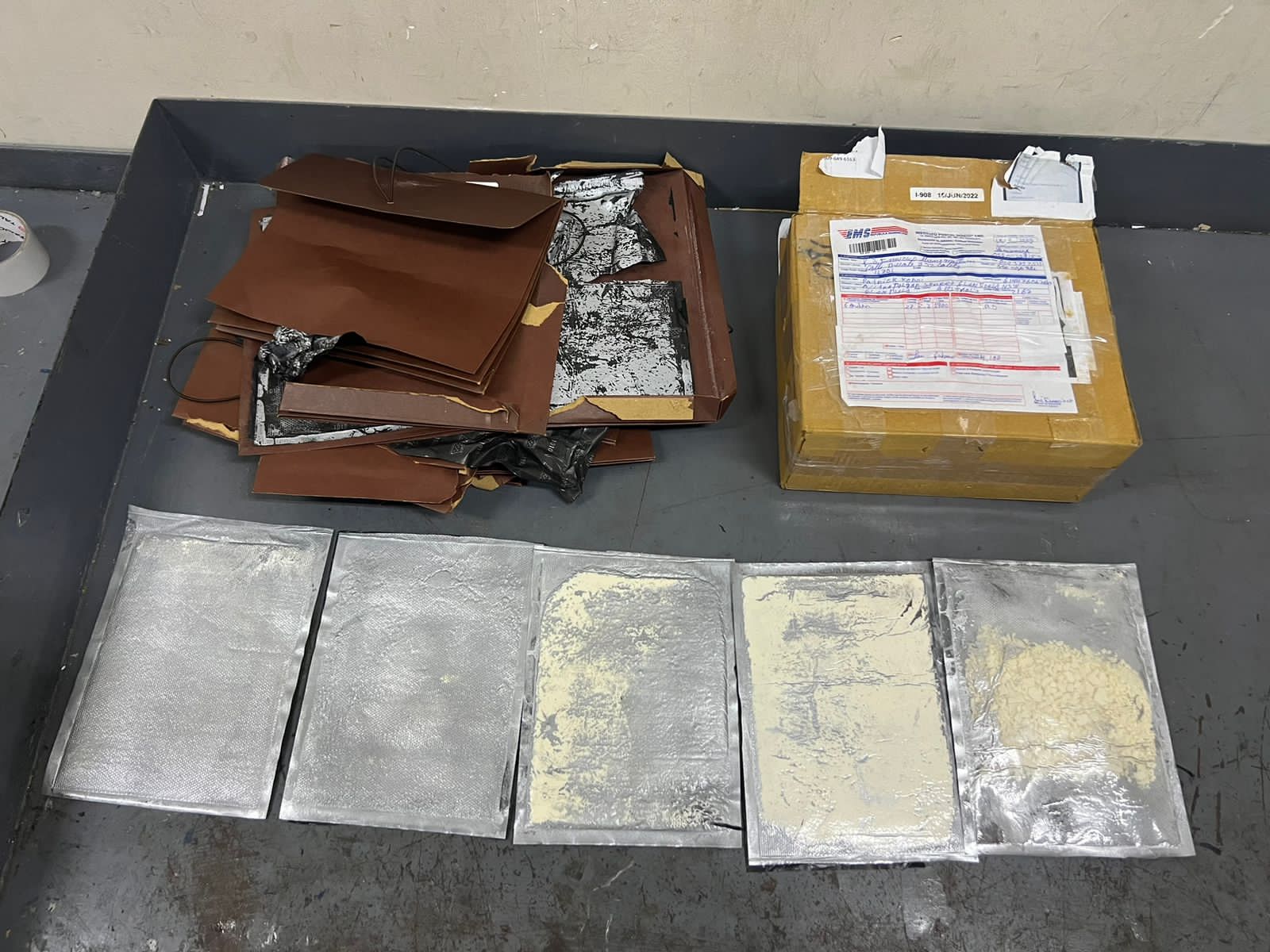 Tras abrir la caja se encontraron varios folder de color marrón, contendiendo un doble fondo con cinco láminas de cocaína, con un peso preliminar de casi medio kilogramo.
