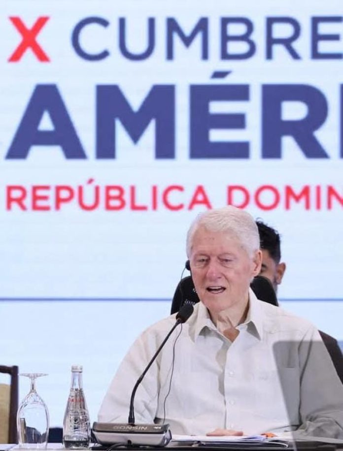 Clinton, en cuya gestión, se realizó la Primera Cumbre de las Américas, habló sentado al lado del presidente Luis Abinader, como uno de los participantes de un evento organizado por el Ministerio de Relaciones Exteriores en el Hotel Westin de Punta Cana.