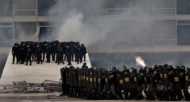 Agentes antidisturbios cargaron contra los manifestantes golpistas con gases lacrimógenos y establecieron un perímetro alrededor de la plaza de los Tres Poderes, donde se encuentran los edificios que albergan los poderes Ejecutivo, Legislativo y Judicial.
