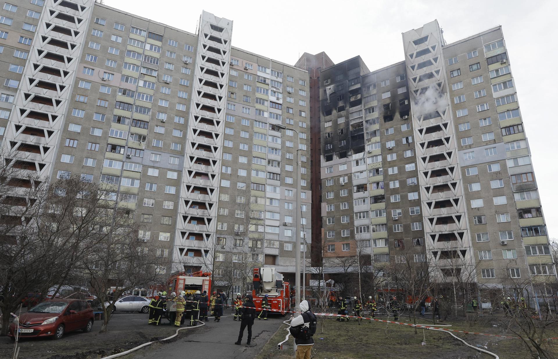 El jefe de la Administración Militar de Kiev, Serguí Popko, que dijo que se trataba del tercer ataque con misiles contra la capital en lo que va de año, informó que los servicios de emergencia evacuaron del edificio 52 personas y extinguieron el incendio.