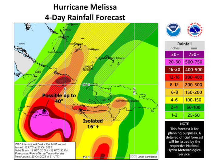 Melissa podría descargar hasta un total de 380 a 760 milímetros de lluvia, con posibilidades de más de 1.000 milímetros en localidades del sur de la Española y Jamaica hasta el miércoles, y entre 152 y 304 milímetros en el sureste cubano, según el NHC, que advierte sobre fuertes precipitaciones adicionales a lo largo de la semana.