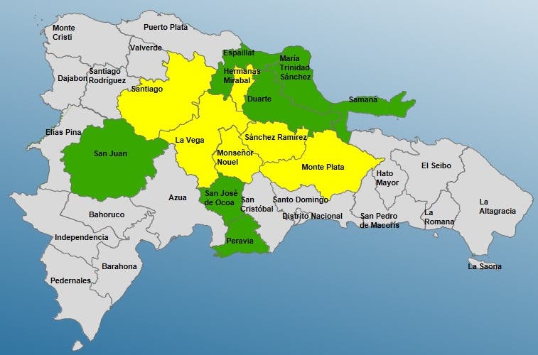 Las provincias en amarillo son: Monseñor Nouel; Sánchez Ramírez; Monte Plata; La Vega; Hermanas Mirabal y Santiago.