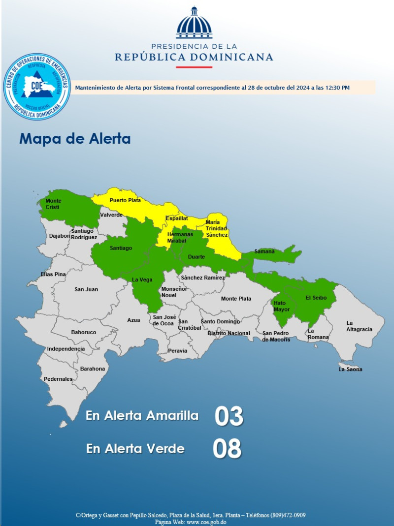 En alerta amarilla están Puerto Plata, Espaillat y María Trinidad Sánchez. Mientras que en alerta verde están Monte Cristi, Santiago, La Vega, Hermanas Mirabal, Duarte, Samaná, Hato Mayor y El Seibo.