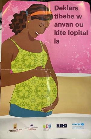 Además, aclara que la cédula no será un requisito obligatorio para recibir atención en el centro, “no te la pedirán (la cédula) para atenderte en el hospital, pero sin ella no podrás declarar a tu bebé”. Abajo de esta frase estaban colocados los logos de la Junta Central Electoral (JCE), Ministerio de Salud Pública, Consejo Nacional para la Niñez y la Adolescencia (Conani), Servicio Nacional de Salud (SNS) y Fondo de las Naciones Unidas para la Infancia (Unicef).