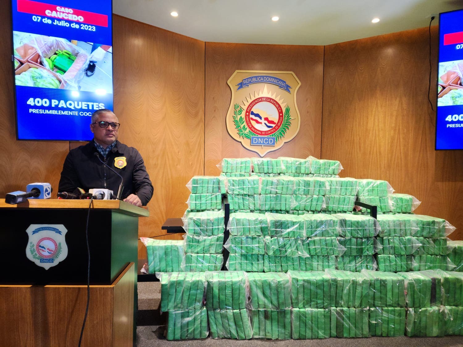 En presencia de un fiscal, se realizó una inspección más rigurosa, encontrado en el interior del contenedor, tipo nevera, decenas de cajas cargadas de guineos, en cuyo interior se ocuparon distribuidos, los 400 paquetes de la sustancia, envueltos en cinta adhesiva de color verde.