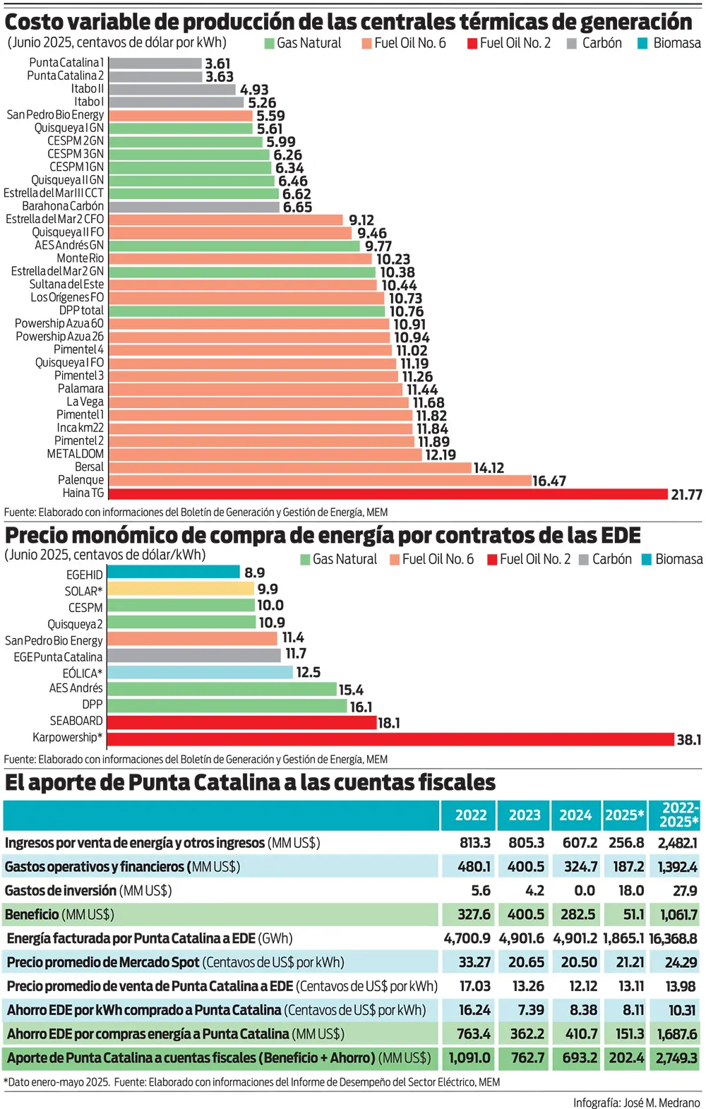 Esa verdad lanzada a viva voz por el presidente ha sido validada año tras año. Cualquiera que se tome la molestia de revisar las publicaciones del Ministerio de Energía y Minas (MEM) en su portal, podrá comprobar cuán cierta fue y sigue siendo aquella valiente afirmación del presidente Abinader. En el Boletín de Generación y Gestión de Energía de junio de 2025, por ejemplo, el MEM presenta un listado del costo variable de producción de las centrales térmicas de generación del país. Cuando se observa el gráfico, se aprecia que las unidades 1 y 2 de Punta Catalina produjeron energía en el pasado mes de junio a un costo variable promedio de 3.61 y 3.63 centavos de dólar por kilovatio hora (kWh). A estas unidades les siguieron Itabo II y I (4.93 y 5.26) y San Pedro Bio Energy (5.59) que opera con biomasa. Luego siguen las plantas de combustible dual, cuando operan con gas natural, Quisqueya I (5.61), propiedad de Puerto Viejo Dominicana Corporation (Barrick), las tres unidades de CESPM (5.99, 6.26 y 6.34) y Quisqueya II (6.46), propiedad de EGE Haina. El abaratamiento en el costo variable de producción de estas últimas cinco plantas ha sido posible gracias a la construcción, durante 2018-2019, del gasoducto que va desde las instalaciones de AES Andrés en Boca Chica hasta San Pedro de Macorís y la conversión, durante 2019-2020, de las tres unidades de CESPM para que pudiesen operar con gas natural, un combustible muchísimo menos costoso que el Fuel Oil #6 que utilizaban las Quisqueya y el Fuel Oil #2 que anteriormente requerían las de CESPM.
