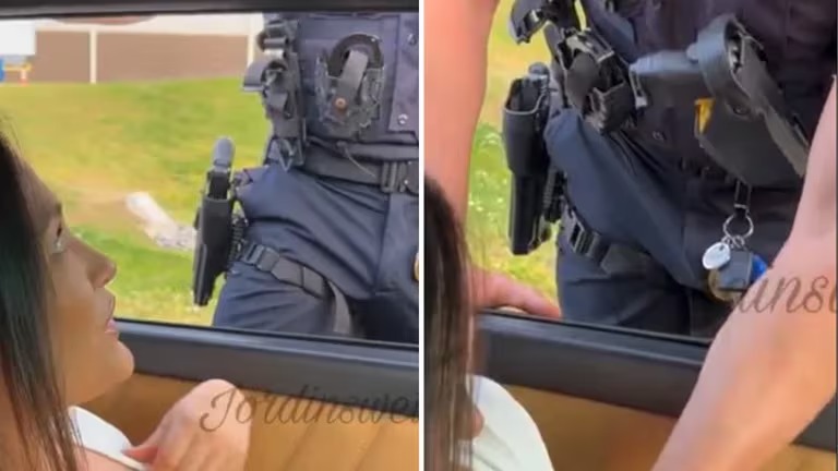 La mujer en el asiento del conductor dice: “No me van a multar… Voy a mostrarle mis tetas”, antes de que el oficial, identificado como “Oficial Johnson de la policía”, declare haberla detenido por exceso de velocidad, pidiéndole su licencia y registro.