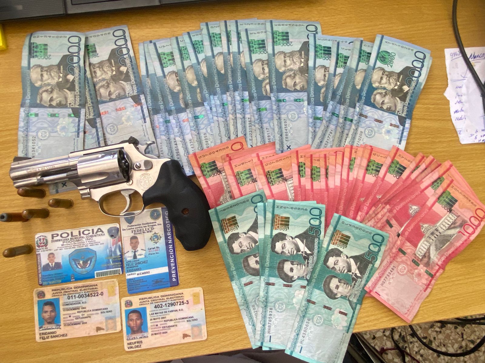 Las autoridades además le ocuparon una cartera con la suma de 71,000 pesos dominicanos en efectivo, así como dos carnets, uno que los identifica como miembros de la Asociación Nacional de la Academia Dominicana de Policías Municipales Comunitaria, como primer teniente, y otro de la Federación de Lucha Contra las Drogas.