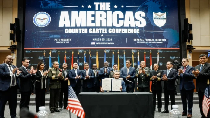 Hegseth lideró la conferencia en la sede del Comando Sur de Estados Unidos (Southcom) en Doral, en el sur de Florida, donde congregó a representantes de casi 20 países de Latinoamérica y el Caribe, como Argentina, Bolivia, Chile, Costa Rica, Ecuador, El Salvador, Guatemala, Panamá, Paraguay, Perú, Honduras y República Dominicana.