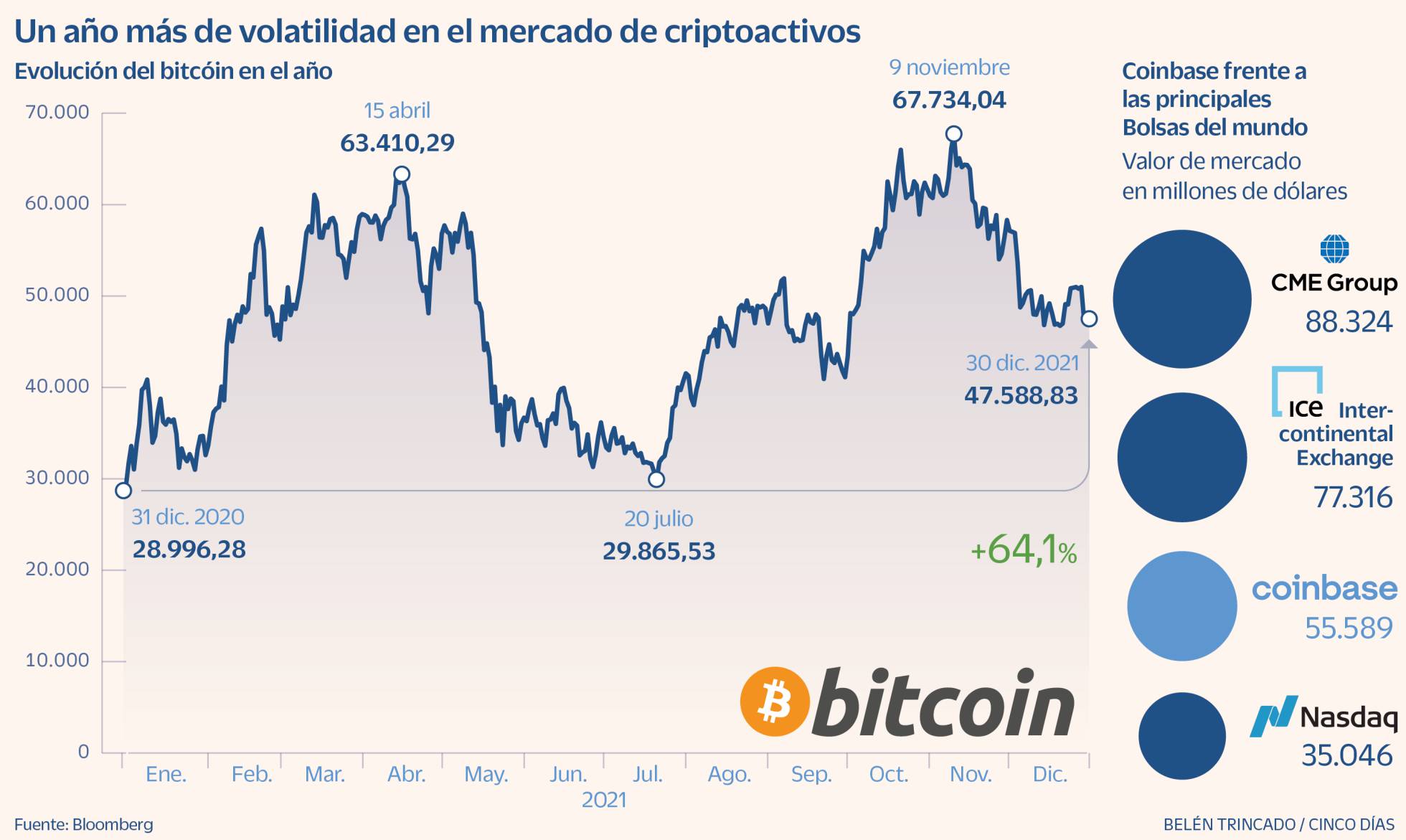 El mercado de los criptoactivos ha alcanzado una valoración de 2,2 billones de dólares y la divisa virtual por excelencia, el bitcóin, acumula una revalorización media anual en los últimos ocho años del 67%, frente al 6,8% del MSCI World Index. Una rentabilidad con enormes dosis de volatilidad: el bitcóin arrancaba el año por debajo de los 30.000 dólares, superó en abril los 63.000 y volvió a perder los 30.000 en julio. Cierra el año sobre los 47.000 dólares.