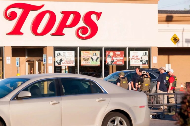 Fotografía de archivo del 15 de mayo de 2022 donde se muestra el lugar dispuesto para honrar la memoria de las víctimas del tiroteo ocurrido en la tienda de comestibles Tops Friendly Market, en Búfalo, Nueva York (EE.UU.).