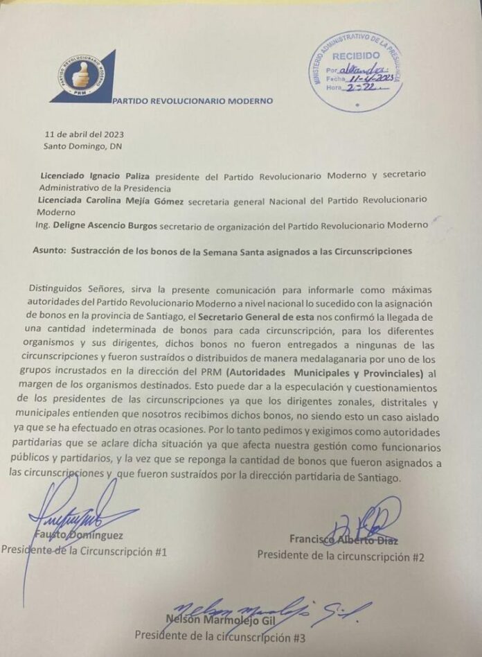 En esa carta sellada con acuse de recibo por el Ministerio Administrativo de la Presidencia y dirigida a José Ignacio Paliza, Carolina Mejía y Deligne Ascención; se les pide una respuesta clara y concreta. Pues, ahora Fausto Domínguez, Nelson Marmolejos y Francisco Alberto Díaz están siendo cuestionados por los dirigentes del partido que creen, al parecer, que estos escondieron los bonos en alguna caja fuerte con códigos indescifrables.