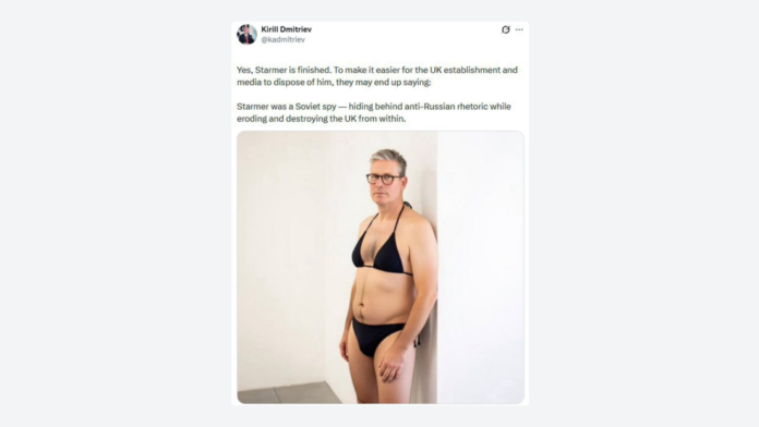 «Sí, Starmer está acabado. Para facilitar que el ‘establishment’ y los medios del Reino Unido se deshagan de él, pueden terminar diciendo: Starmer era un espía soviético que se escondía detrás de la retórica antirrusa mientras erosionaba y destruía al Reino Unido desde adentro», escribió el funcionario este miércoles en X. Dmítriev acompañó la publicación con una imagen generada con inteligencia artificial del mandatario británico en traje de baño.
