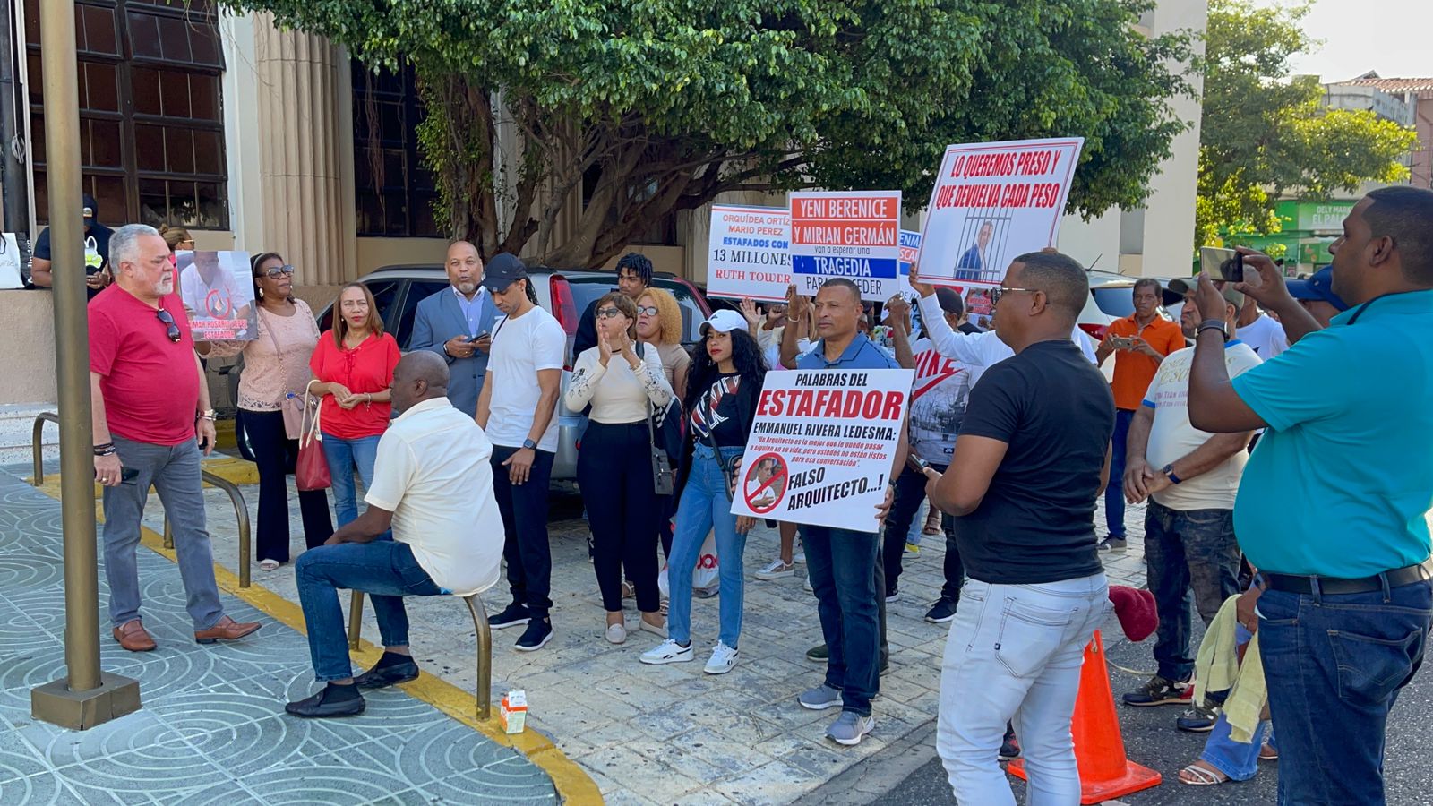 Con pancartas en manos y bajo el eslogan “Félix Portes qué pasó que Emmanuel no nos ha pagado”, ciudadanos se manifiestan en las afueras del Palacio de Justicia, donde se le conocerá, este martes, medida de coerción al pseudo arquitecto Emmanuel Rivera, acusado de múltiples estafas.