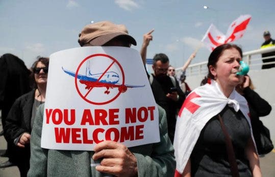 Los manifestantes, que portaban pancartas con frases ofensivas contra de Rusia y banderas de Georgia, Estados Unidos, Ucrania y la Unión Europea, silbaban y gritaban contra de la reanudación de los vuelos, detenidos en junio de 2019 tras intensas protestas antirrusas.