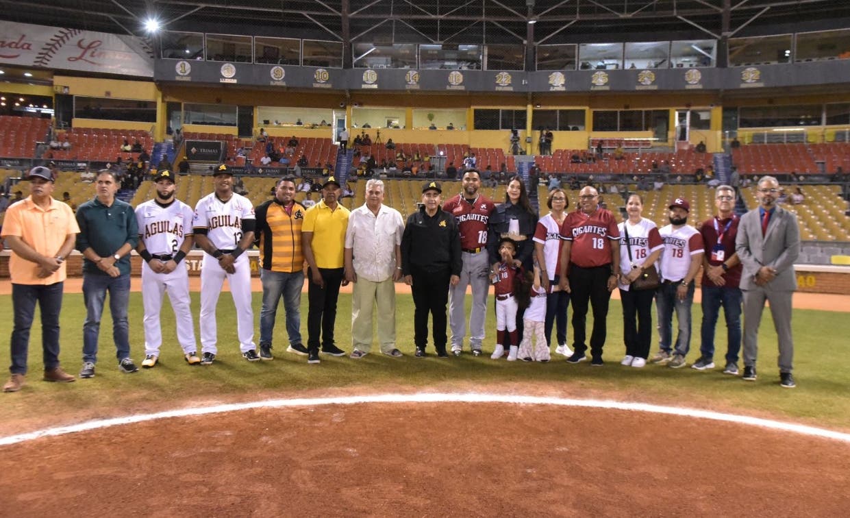 La directiva de las Águilas ofreció una cálida despedida a Nelson Cruz, quien tiró la primera bola y la recibió Tony Peña.