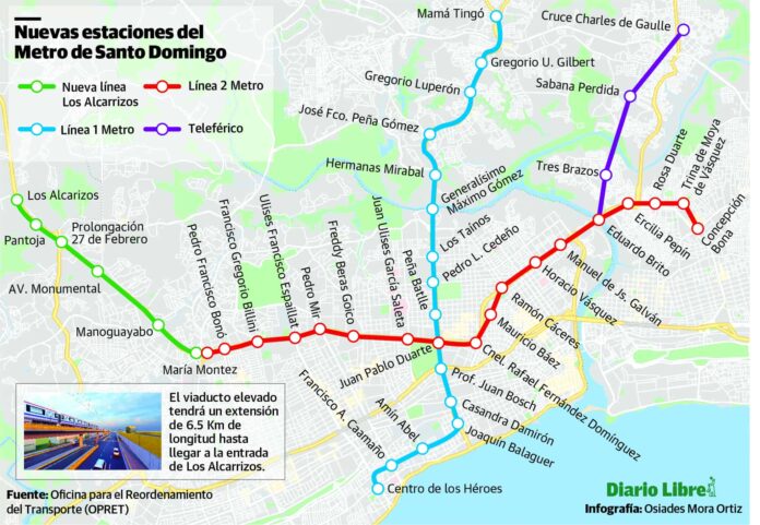 En total, la obra irá desde el kilómetro 9 de la Autopista Duarte, hasta la entrada de Los Alcarrizos. Allí, los usuarios podrán abordar el teleférico que se llevará el nombre de ese municipio.