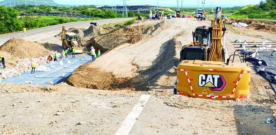 Aunque brigadas trabajan intensamente en turnos de 12 horas desde hace unos 18 días, las grietas que las lluvias de la tormenta Melissa abrieron en el asfalto de la Avenida Circunvalación de Baní, en la zona de Galeón, aún siguen abiertas.