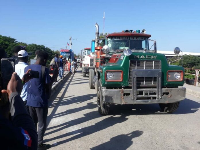 El cruce de camiones se lleva a cabo este sábado bajo estrictas medidas de seguridad por parte de los militares del Cesfront y la policía fronteriza POLIFRONT en el lado haitiano del puente que divide a ambos países.[OJO-EC-ac]