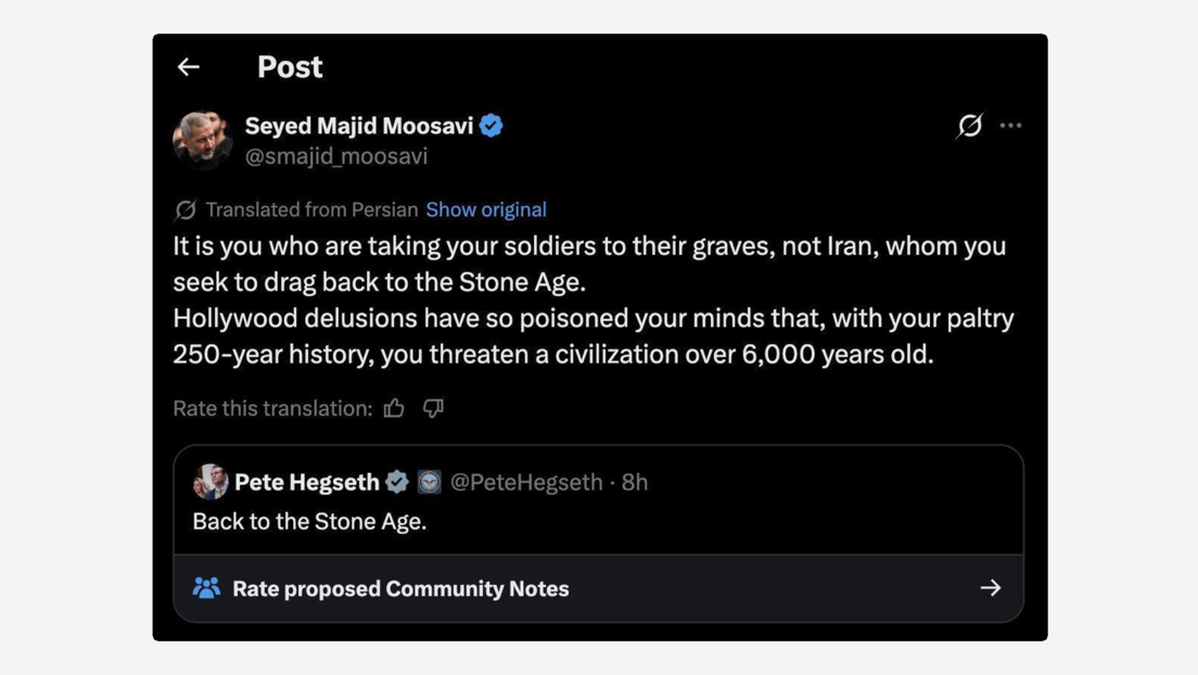 En un mensaje publicado en la plataforma X, Moosavi respondió directamente a una publicación de Hegseth en la que el funcionario estadounidense afirmó que, tras los ataques estadounidenses, Irán regresará «a la Edad de Piedra».