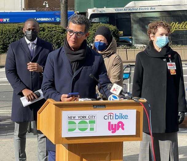 “El ciclismo ha jugado un papel fundamental para mantener la ciudad en movimiento durante la pandemia, dijo durante una rueda de prensa frente al hospital Presbiteriano Medical Center, en Broadway con la calle 168, en el Alto Manhattan, bajo temperatura ártica.