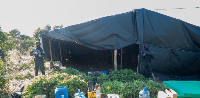 Al incursionar en el área, las autoridades localizaron 1,835 plantas de marihuana, de aproximadamente dos metros de altura. Además, ocuparon dos cubetas llenas del vegetal, cinco extractores, cuatro extensiones eléctricas, una bomba de regadío, herramientas, un tanque, tres botellones de agua, dos colchonetas de espuma, una carretilla, rollos de tela, un serrucho, varios garrafones de combustible y otras evidencias.