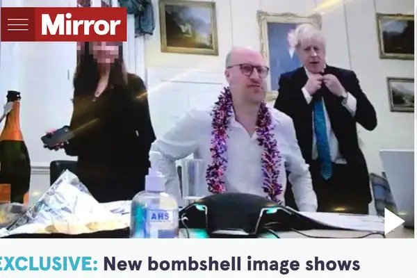 El escándalo del “Partygate” suma un nuevo episodio después de que el tabloide británico “The Mirror” difundiera una nueva foto del “premier” Boris Johnson en una reunión social celebrada el 15 de diciembre 2020 dentro de Downing Street, en plena pandemia de coronavirus, en la que se aprecia con claridad una botella de champán abierta, una bolsa de patatas fritas y gente de su equipo con collares de espumillón e incluso sombreros de Papá Noel.