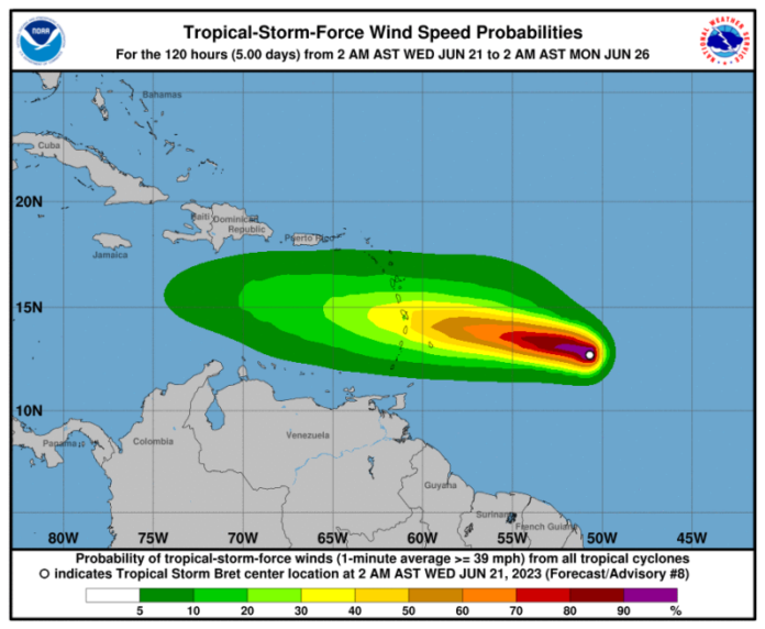 La Oficina Nacional de Meteorología (Onamet), informa que la tormenta tropical Bret, localizada a unos 1,000 km al Este de las Islas de Barlovento, Antillas Menores, se mueve hacia el oeste a unos 26 kilómetros por hora, con vientos máximos de 95 km/h con ráfagas superiores.