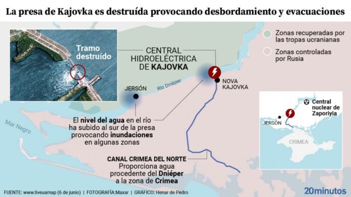 Según Kiev, la destrucción de Kajovka se habría producido por una explosión registrada en el interior de la presa, una hipótesis que el gobierno ucraniano ya denunció el pasado octubre, cuando alertó de que las tropas rusas habían minado esa infraestructura para poder volarla en caso de necesidad.
