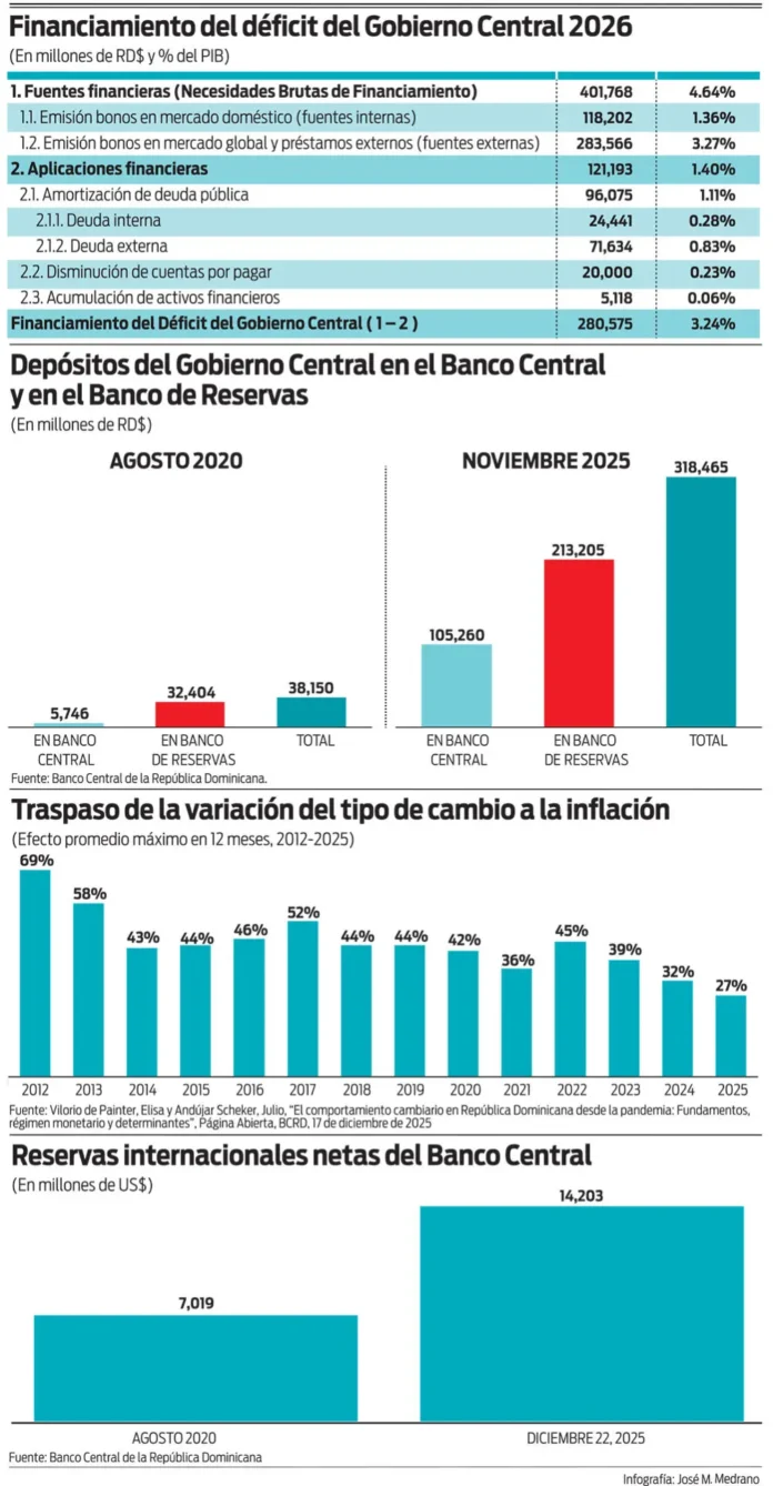 Aun reduciendo los depósitos en el Banco Central y Banco de Reservas en RD$121,193 millones, el Gobierno Central terminaría con depósitos ascendentes a RD$197,272 millones a final de 2026, más de 5 veces el nivel heredado en agosto de 2020. Tendría margen, si lo desea, para reducir aún más la colocación de nueva deuda pública o para estimular gradualmente la inversión pública y acelerar la recuperación del ritmo de crecimiento que perdimos en 2025. Alguien podría decir que la sustitución de endeudamiento interno y externo por el uso de depósitos podría generar presiones devaluatorias e inflacionarias. En la medida en que el Banco Central mantenga su credibilidad, su firmeza en la defensa de la meta de inflación y la disposición de utilizar sus elevadas reservas internacionales netas para moderar la depreciación y la volatilidad de la tasa de cambio, no hay motivos para preocupación. Para 2026 se proyecta una depreciación anual promedio de 5.6%. Con un efecto traspaso (“pass-through”) de la depreciación del peso a la inflación que ha promediado 0.36 (36% en los últimos 5 años), según estimaciones realizadas por el Banco Central, una depreciación de 5.6% o ligeramente mayor mantendría la inflación dentro del rango meta (4% +/- 1%).