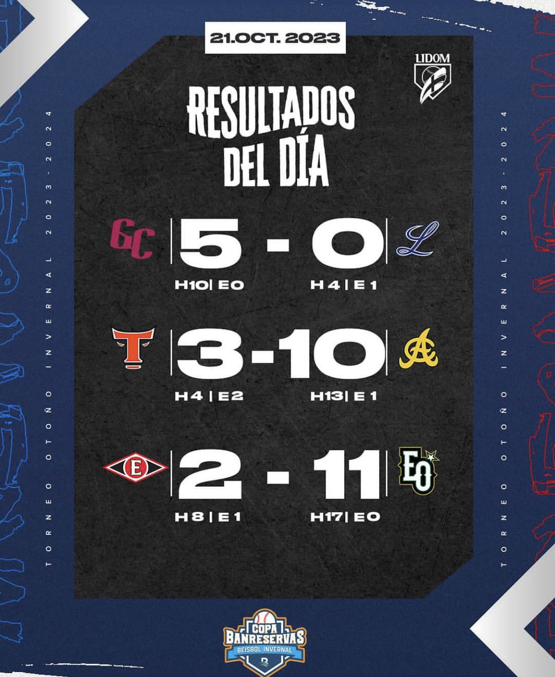 Mientras, en un juego demorado por la lluvia, los Gigantes del Cibao blanquearon a los Tigres del Licey con marcador de 5 por 0, devolviéndole el favor en la jornada previa.