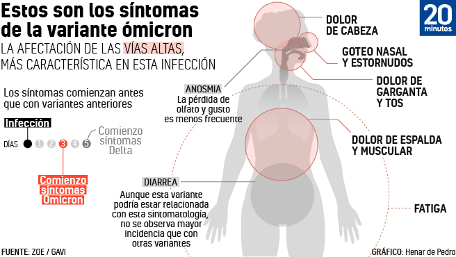Por otra parte, la Alianza para la Vacunación GAVI recoge que los cinco síntomas más comunes con ómicron son la mucosidad nasal, el dolor de garganta, el dolor en la parte inferior de la espalda y dolor muscular, y el cansancio. Respecto a la tos, tan frecuente con variantes anteriores de este coronavirus pandémico, parece que ha sido desplazada por el dolor de garganta con la aparición de ómicron.