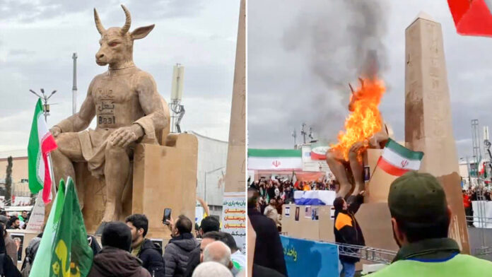 Manifestantes iraníes queman una estatua de ‘Baal Epstein’