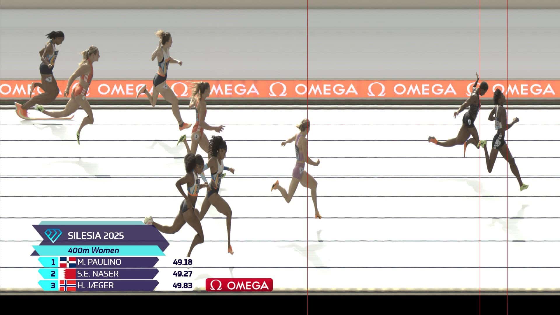 Paulino venció con autoridad a su gran rival, la barení Salwa Eid Naser (49.27), y a la noruega Henriette Jaeger (49.83), en una competencia donde dejó claro que está en su mejor forma física y mental. Muy rezagada terminó la neerlandesa Lieke Klaver, quien llegaba como líder de la serie, pero finalizó octava con un tiempo de 50.53 segundos.