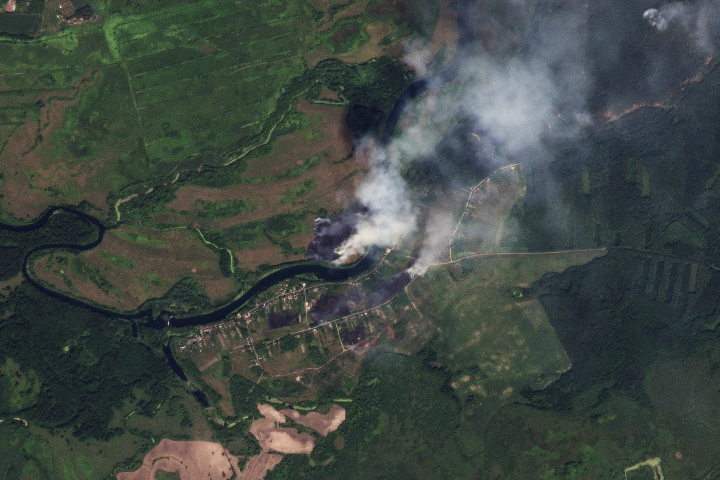 Imágenes por satélite de Planet Labs PBC analizadas el miércoles por The Associated Press mostraban un incendio considerable en el Seym cerca de la población de Krasnooktyabrskoe.