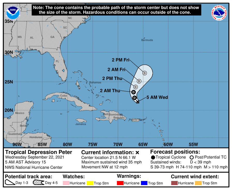 Este miércoles el Centro Nacional de Huracanes estadounidense informó que la tormenta tropical Peter bajó su intensidad y pasó a ser una depresión tropical.