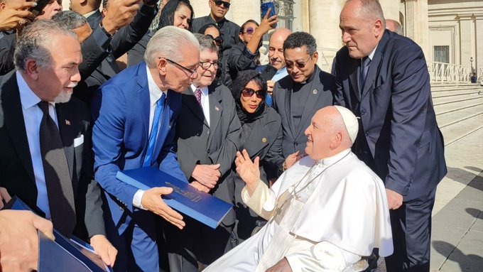 InicioInternacionalesPintores dominicanos regalan al papa libro de 17 kilos con pintura de...