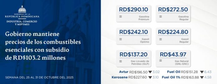 Para la semana del del 25 al 31 de octubre 2025, los combustibles se comercializarán a los precios siguientes: