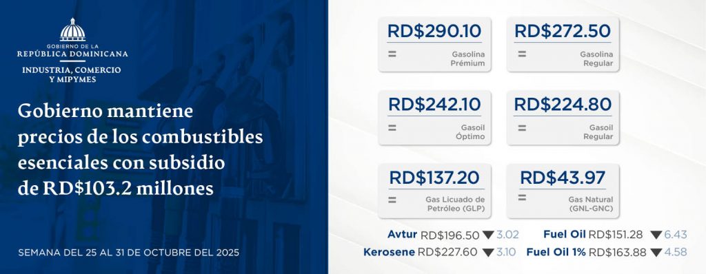 - Avtur, RD$196.50 por galón; baja RD$3.02.