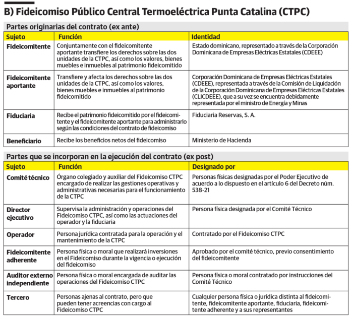 Como se advierte en la gráfica B, en el contrato de fideicomiso intervienen varias partes originarias, como son los fideicomitentes (Estado dominicano y CDEEE), la fiduciaria (Fiduciaria Banreservas, S. A.) y el fideicomisario o beneficiario (el Ministerio de Hacienda). Como se nota, la operación se queda en el Estado, quien aporta los activos, valores y bienes que integrarán el patrimonio fideicomitido y recibe los ingresos de la explotación del patrimonio fideicomitido gestionado por una fiduciaria en la que tiene control accionario. Ahora, en la ejecución del contrato intervienen otros sujetos o actores. Algunos forman parte de la estructura operativa, técnica y supervisora que acompaña a la fiduciaria en su administración (comité técnico, la unidad gerencial, el director ejecutivo, el operador, el auditor); sin embargo, aparecen otros actores de forma transversa y ambigua, como son los fideicomitentes adherentes y los terceros de los cuales apenas se proponen sus definiciones. Ahí entramos al problema, ya que por vía de los fideicomitentes adherentes pueden penetrar inversiones privadas. Veamos por qué.