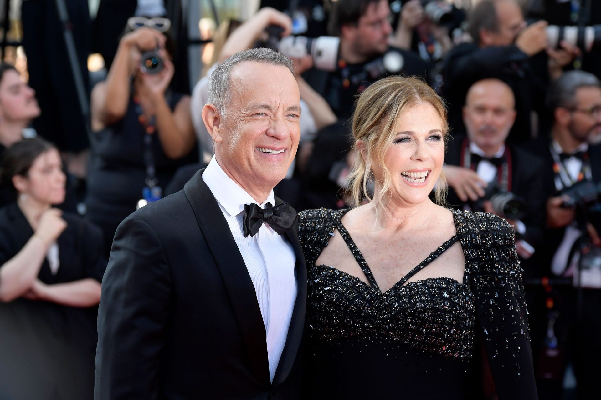 (De izquierda a derecha) Un miembro del personal del Festival de Cannes, Tom Hanks y Rita Wilson en el estreno de «Asteroid City» el martes en Francia. Antonin Thuillier/AFP/Getty Images