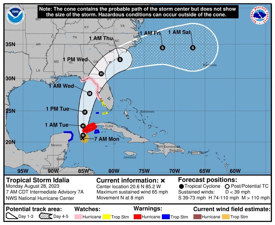 A las 8:00 de la mañana del lunes, la tormenta se encontraba a unos 150 kilómetros (90 millas) del extremo occidental de Cuba con vientos máximos sostenidos de 100 km/h (65 mph). La tormenta se desplazaba hacia el norte a 13 km/h (8 mph) en ese momento, de acuerdo con el centro de huracanes.
