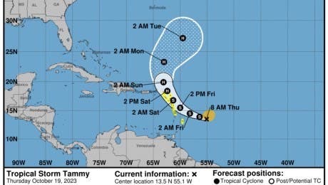 En esta trayectoria prevista, se pronostica que el centro de Tammy se mueva cerca o sobre partes de las Islas de Sotavento hasta principios del domingo y luego se desplace al norte de las Islas de Sotavento el domingo por la tarde.
