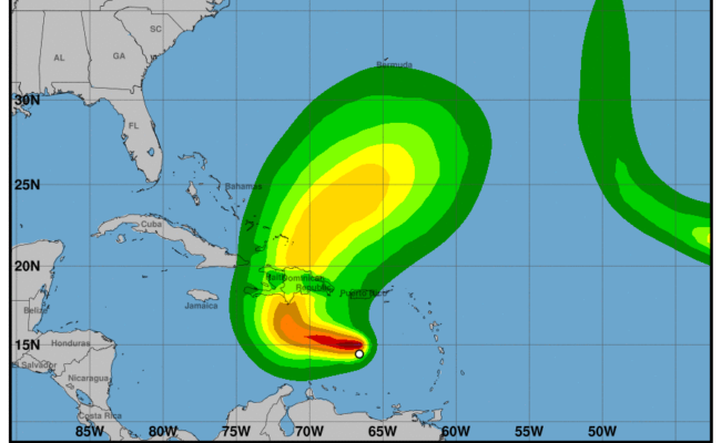 Se espera que en la noche gire gradualmente hacia el noroeste y en tal sentido, el COE emite aviso de por tormenta tropical desde la isla Saona hasta la frontera con Haití (Pedernales) y condiciones de tormenta tropical desde la Isla Saona hasta Montecristi.