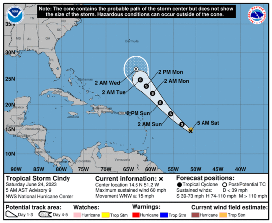 Indica que Bret se mueve hacia el oeste a unos 30 km/h y se espera que se mantenga con esta   velocidad de traslación durante el transcurso del fin de semana.