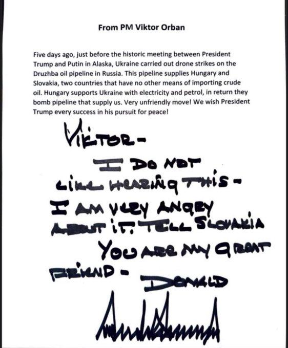 «No me gusta oír esto, estoy muy enfadado por ello. Dígaselo a Eslovaquia. Usted es mi gran amigo», escribió Trump en respuesta a una carta enviada previamente a este por el primer ministro de Hungría, Viktor Orbán.
